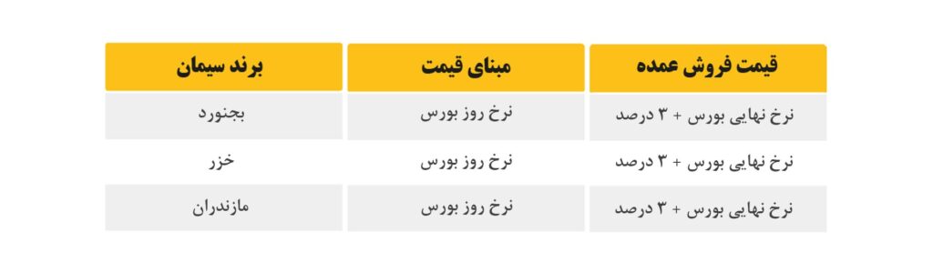 • بر اساس نرخ نهایی بورس (قیمت پایه سیمان در آن هفته (یا قیمت رقابت شده در بورس) +10% مالیات بر ارزش افزوده  + 3% کارمزد فروش)